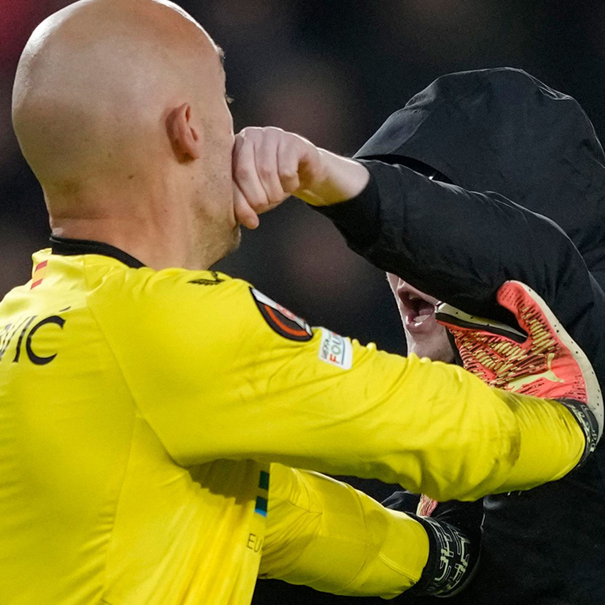 De fan zou de doelman tegen de borst hebben geduwd en probeerde hem bij het shirt te grijpen. De speler struikelde achteruit, duidelijk overrompeld door de aanval. Stewards en teamgenoten grepen onmiddellijk in en trokken de supporter weg voordat er ernstiger schade kon ontstaan.