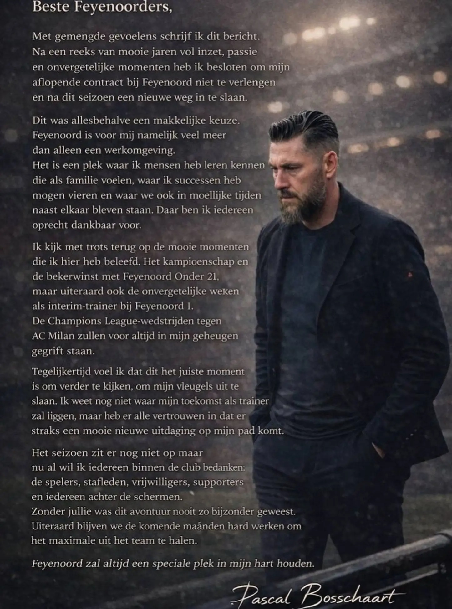 🚨 EMOTIONEEL AFSCHEID BIJ FEYENOORD: Pascal Bosschaart KONDIGT VERTREK AAN NA PERSOONLIJKE BRIEF AAN SUPPORTERS
