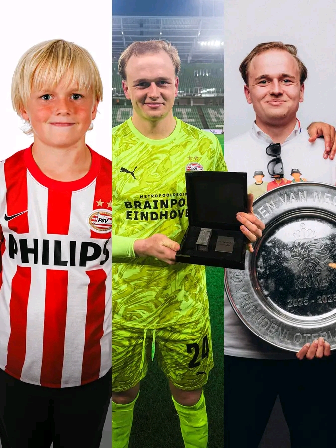 Bij de post zijn beelden toegevoegd die zijn ontwikkeling laten zien—van jonge PSV-supporter tot professionele doelman met een trofee in handen. Deze beelden onderstrepen de sterke focus van PSV op het opleiden van eigen talent.